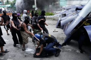MANILA–Philippine police arrested 49 people suspected of hurling rocks, bottles and fire bombs at officers and blocking heavily guarded